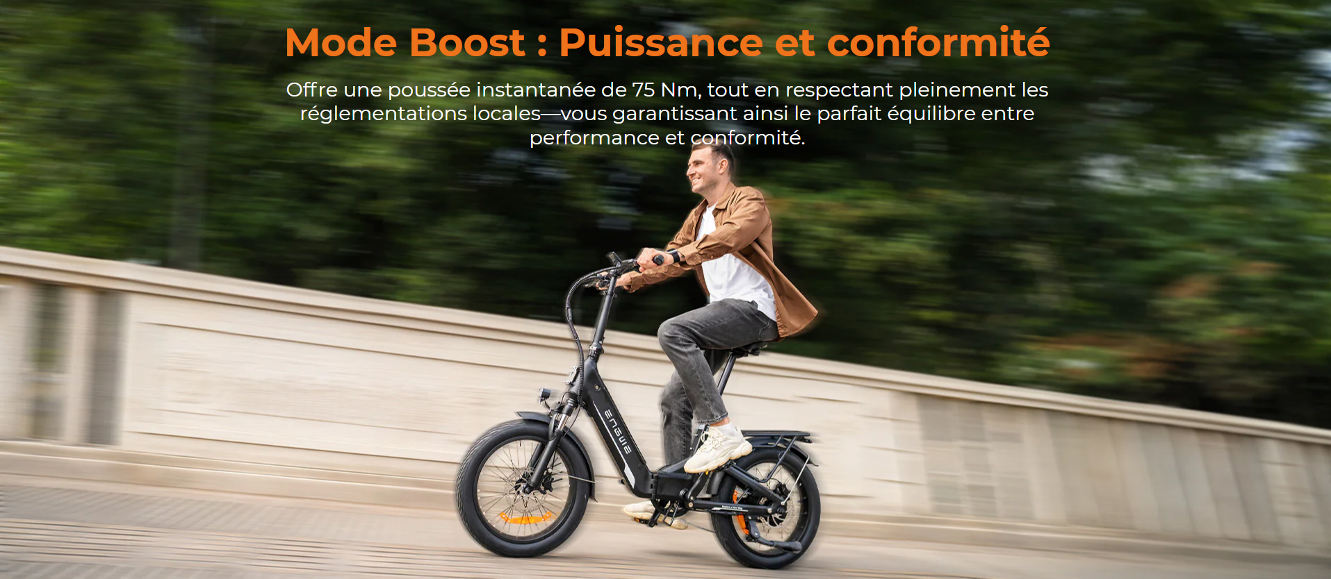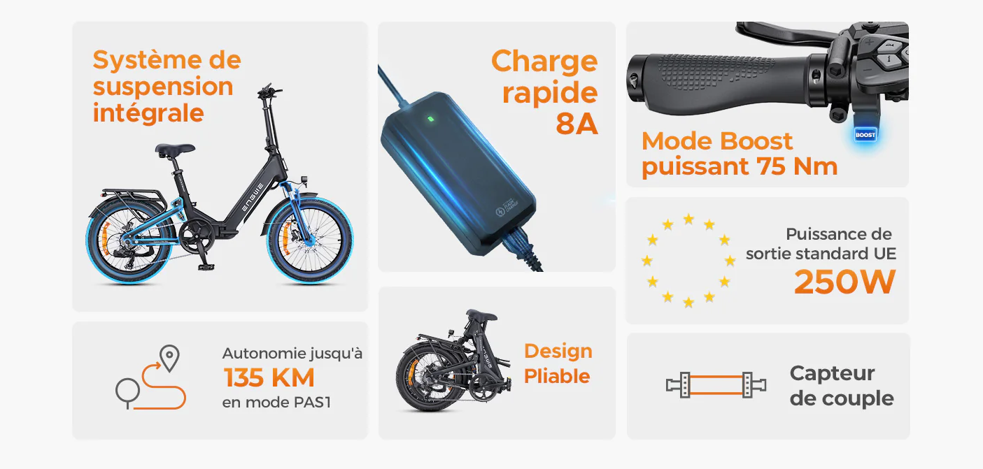 Moteur Le vélo est équipé d’un moteur de moyeu 48 V offrant un couple maximal de 75 Nm, parfait pour des accélérations dynamiques et une assistance efficace.