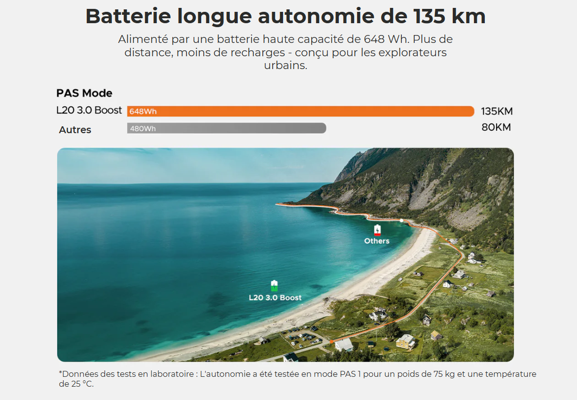 Autonomie Testée en laboratoire, l’autonomie atteint jusqu'à 135 km avec une charge complète. En conditions réelles, l’autonomie varie selon le niveau d’assistance : 120 km en mode PAS 1, 100 km en mode PAS 3 et 85 km en mode PAS 5.