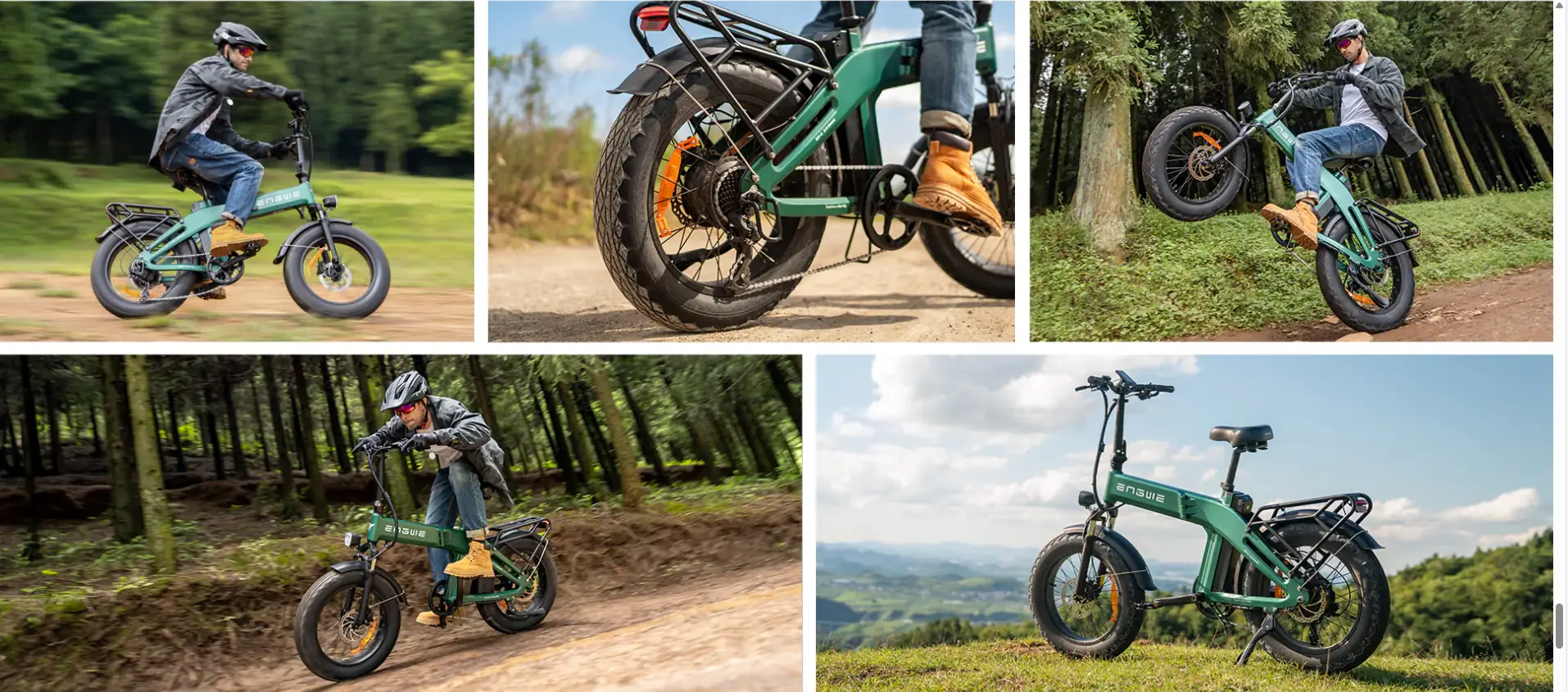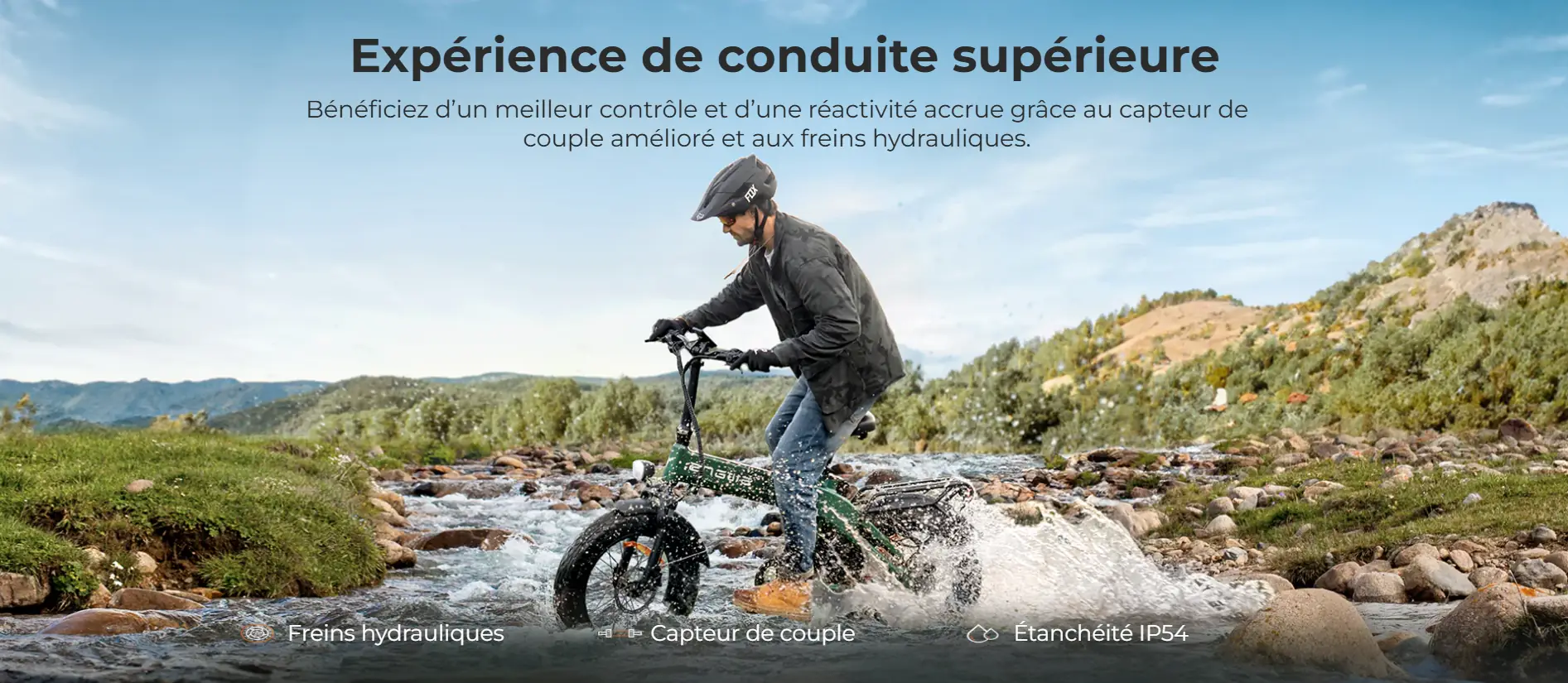 Roues et pneumatiques Roues 20'' × 4.0'' avec jantes aluminium double paroi et protection anti-crevaison de 3 mm. Adaptées aux routes goudronnées, chemins de gravier, plages de sable et sentiers de campagne.