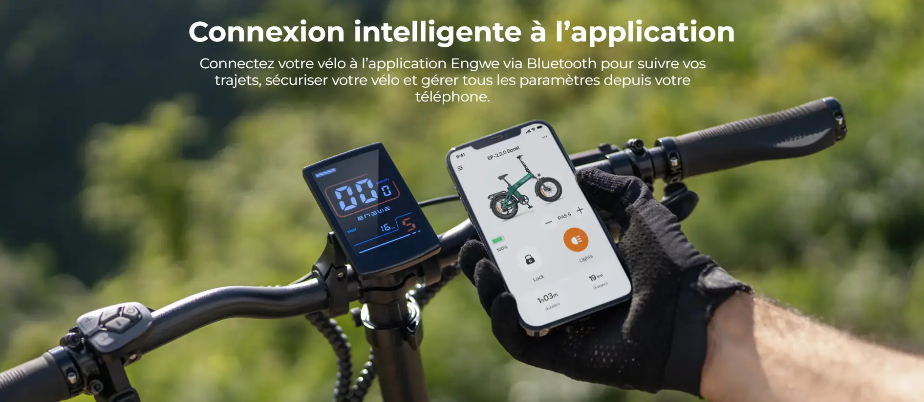 Technologie embarquée Écran couleur LCD 3,5'' avec Bluetooth. Compatible avec l’application ENGWE pour contrôle à distance et suivi des trajets.