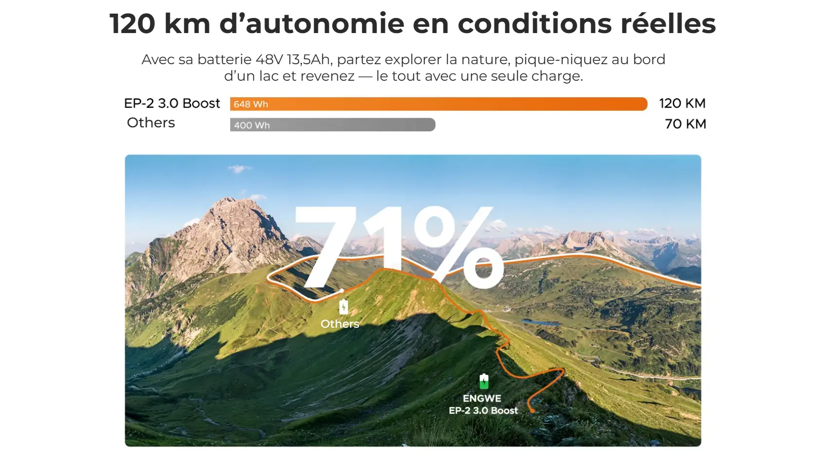 Batterie et autonomie Batterie 48V 13,5Ah (648 Wh) avec cellules 21700 et BMS. Autonomie réelle de 120 km (PAS 1), 100 km (PAS 3) et 80 km (PAS 5). Recharge via chargeur 54,6V / 4A.