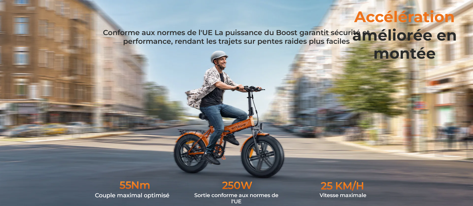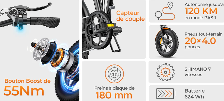 Puissance et performance Découvrez le EP-2 Boost, un vélo électrique au moteur sans balais de 250 W qui vous propulse jusqu’à 25 km/h avec une puissance de 55 Nm. Ses pneus Fat 20 x 4.0 garantissent une stabilité et une traction exceptionnelles sur tous les terrains.