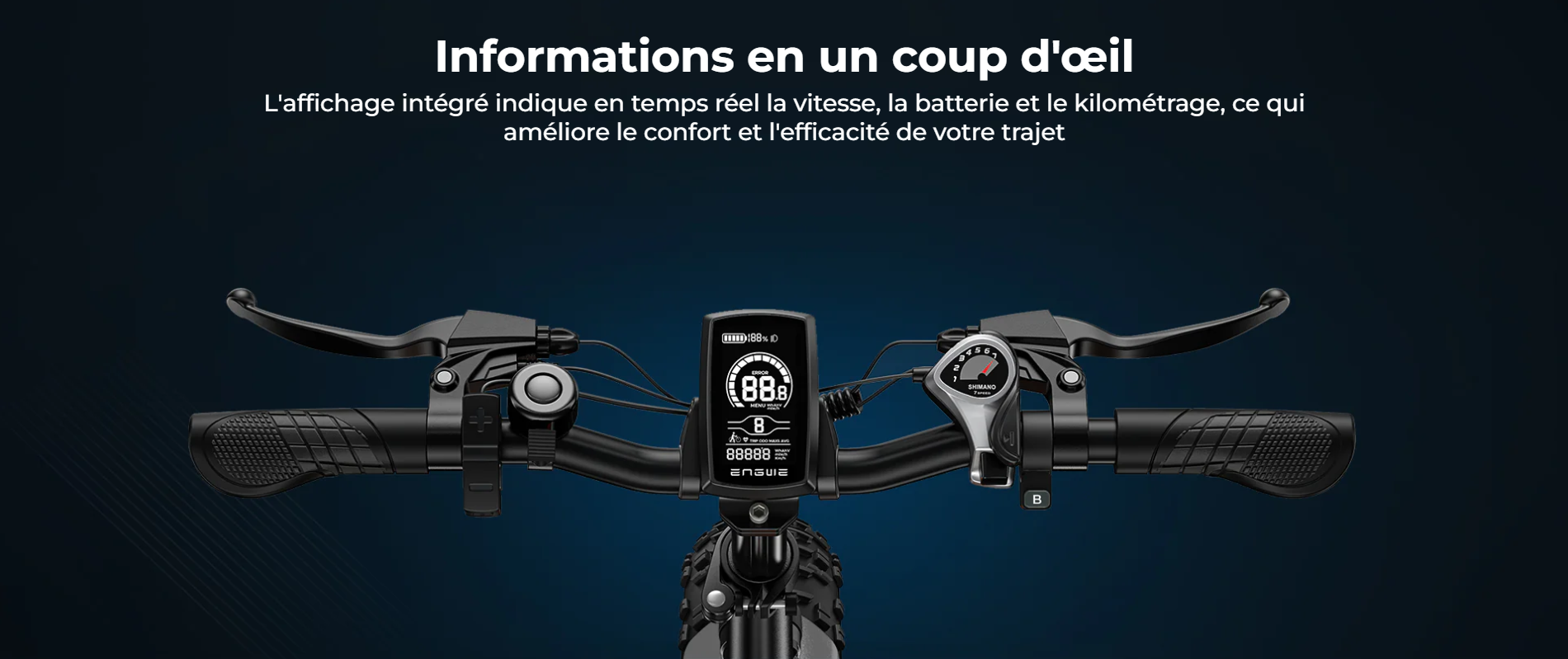 Confort et maniabilité Grâce à son système de transmission Shimano 7 vitesses et son écran LCD intuitif, profitez d’un contrôle total et d’une expérience de conduite confortable, adaptée à tous les types de sorties.